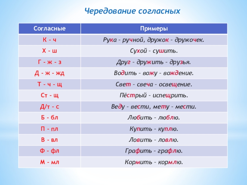 Отец – отеческий, блеск – блестеть- блещу, земля- земной, вести – водить- вожу, вождение, крутой – круче,