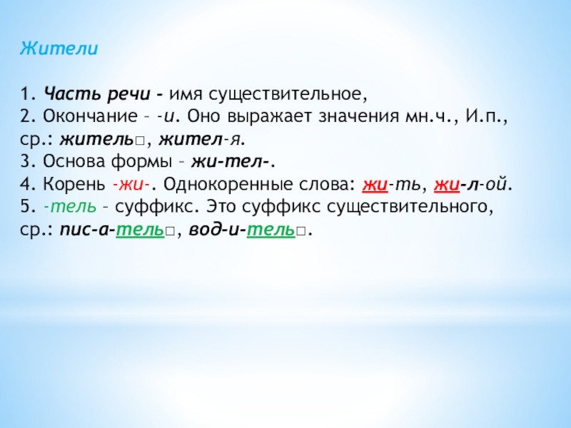 5. -тель – суффикс. Это суффикс существительного, ср.: пис-а-тель□, вод-и-тель□.