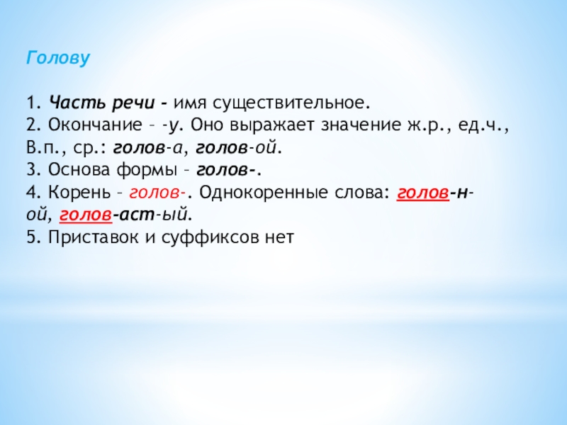 4. Корень – голов-. Однокоренные слова: голов-н-ой, голов-аст-ый.