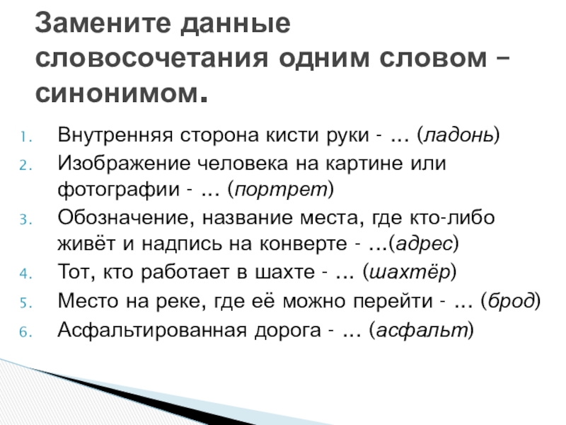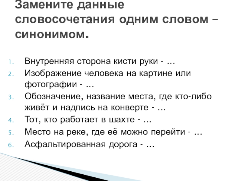 Замените данные словосочетания одним словом – синонимом.