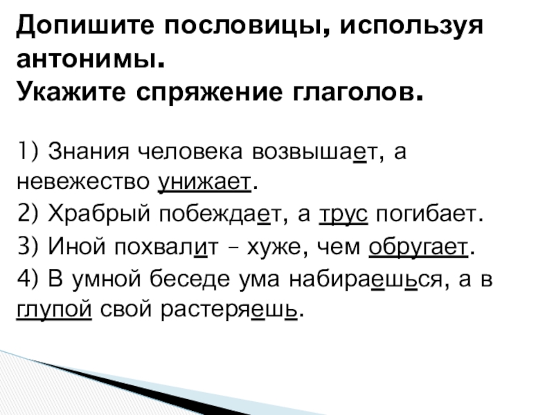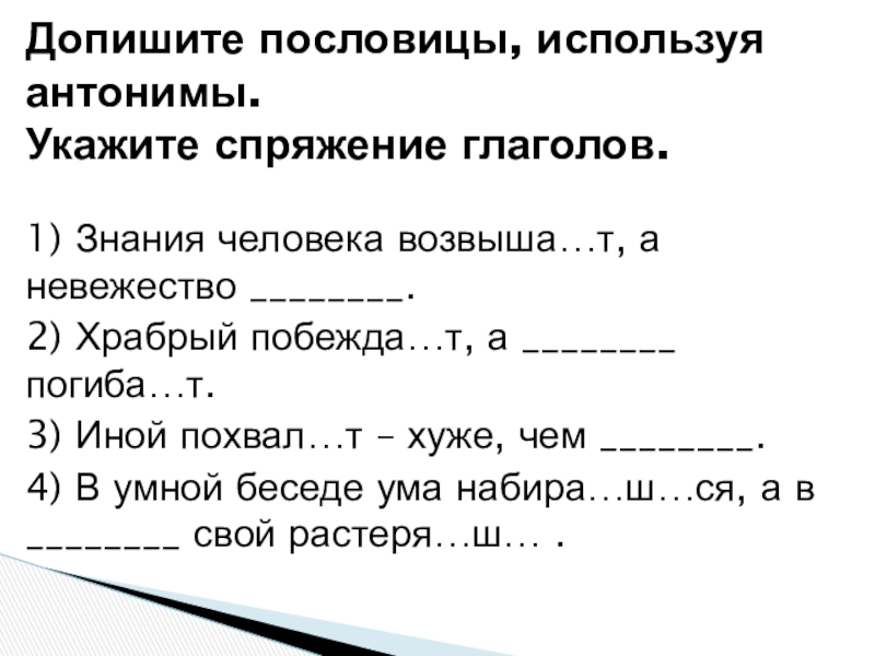 Допишите пословицы, используя антонимы.