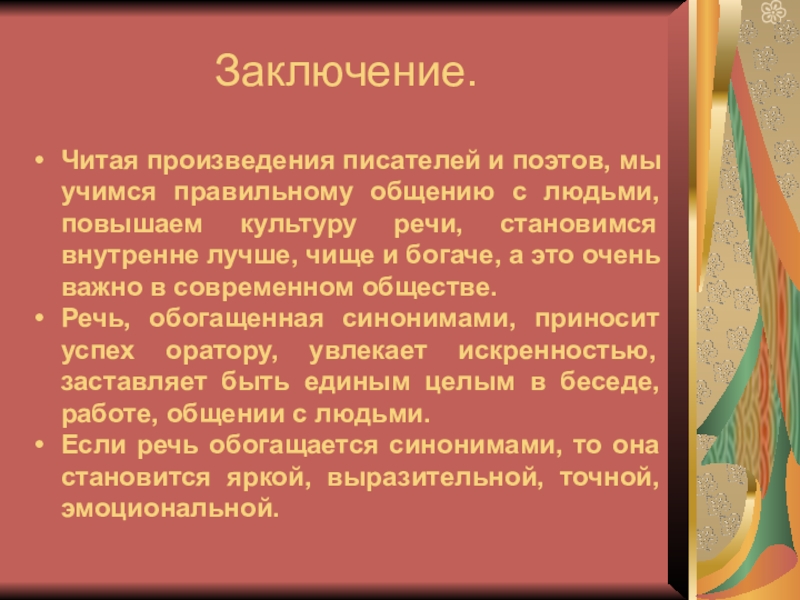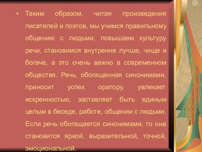 Речь, обогащенная синонимами, приносит успех оратору, увлекает искренностью, заставляет быть единым целым в беседе, работе, общении с людьми.