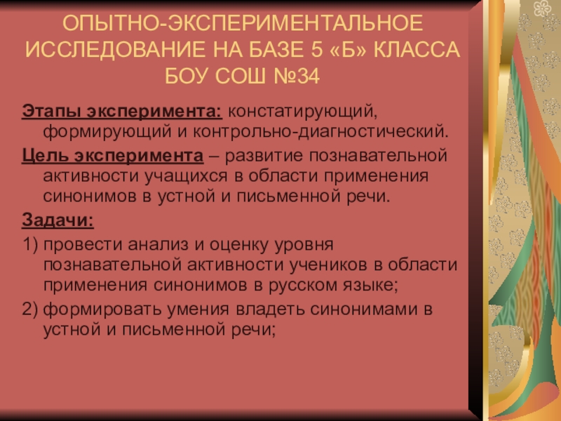 Цель эксперимента – развитие познавательной активности учащихся в области применения синонимов в устной и письменной речи.