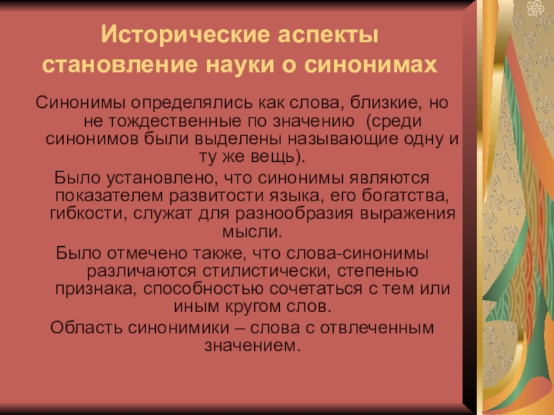 Слайд 7Исторические аспекты становление науки о синонимах