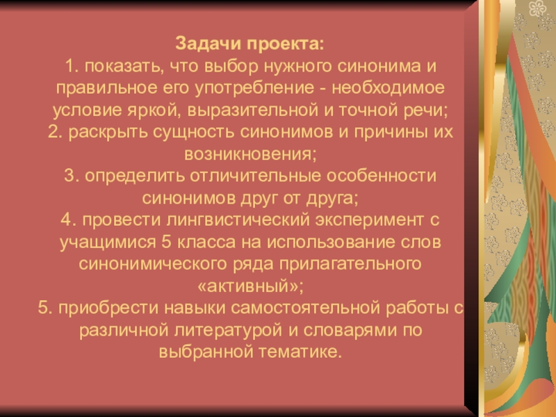 4. провести лингвистический эксперимент с учащимися 5 класса на использование слов синонимического ряда прилагательного «активный»;