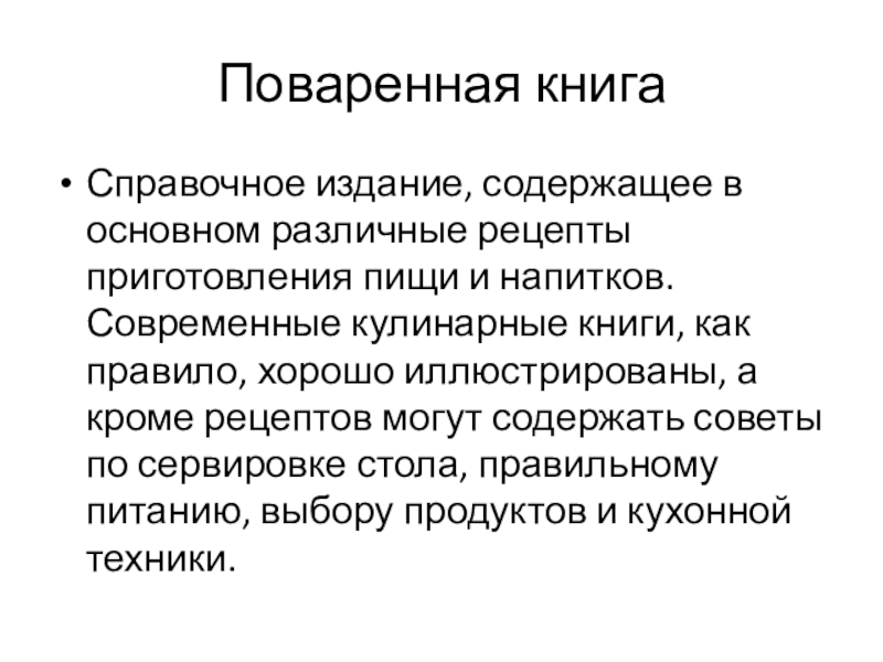 Поваренная книгаСправочное издание, содержащее в основном различные рецепты приготовления пищи и напитков. Современные кулинарные книги, как правило,