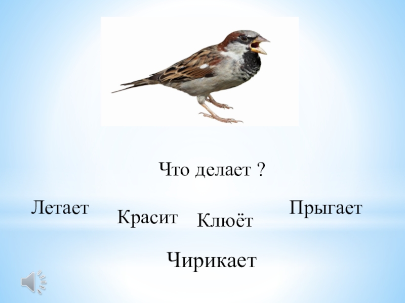Летает Красит Клюёт Прыгает Что делает ?Чирикает