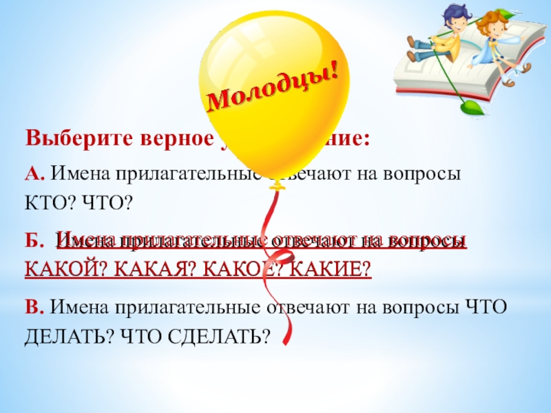 Имена прилагательные отвечают на вопросы КАКОЙ? КАКАЯ? КАКОЕ? КАКИЕ?
