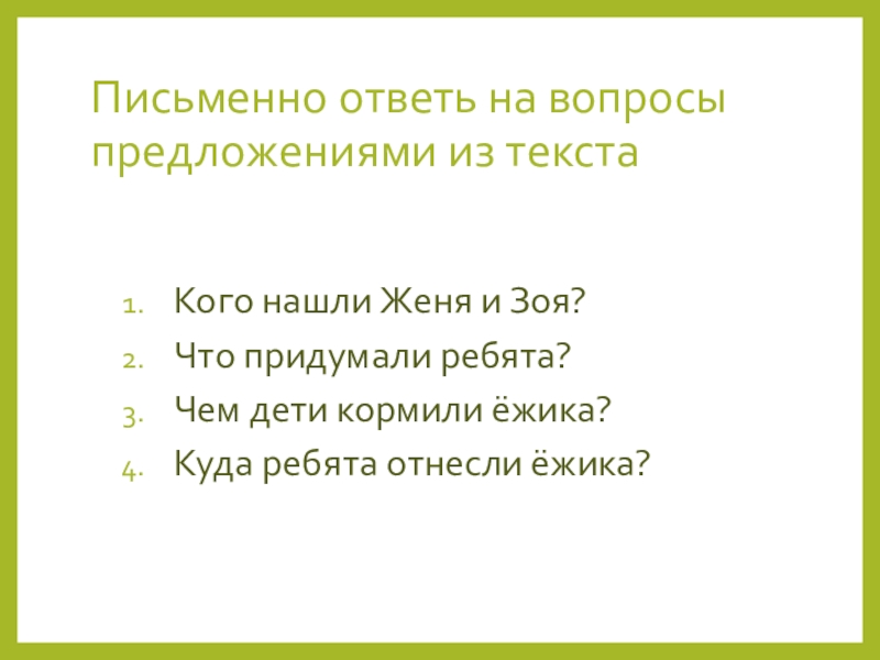 Письменно ответь на вопросы предложениями из текстаКого нашли Женя и Зоя?Что придумали ребята?Чем дети кормили ёжика?Куда ребята