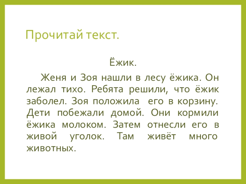 Прочитай текст. Ёжик. Женя и Зоя нашли в лесу ёжика. Он лежал тихо. Ребята решили, что ёжик заболел. Зоя положила его в корзину. Дети побежали домой. Они кормили ёжика молоком. Затем отнесли