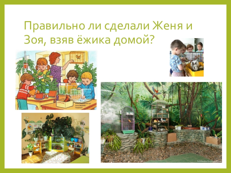 Слайд 5Правильно ли сделали Женя и Зоя, взяв ёжика домой?
