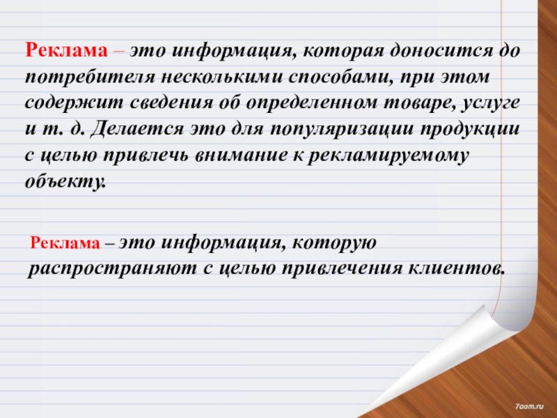 Реклама – это информация, которую распространяют с целью привлечения клиентов.