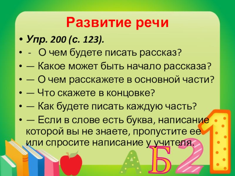 Развитие речиУпр. 200 (с. 123). -  О чем будете писать рассказ?— Какое может быть начало рассказа?—