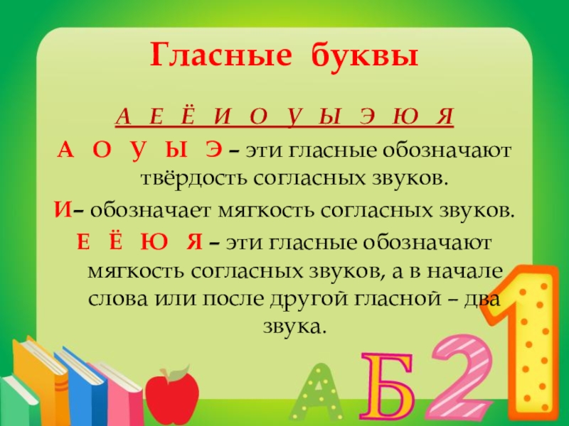 Е Ё Ю Я – эти гласные обозначают мягкость согласных звуков, а в начале слова или после другой гласной – два звука.