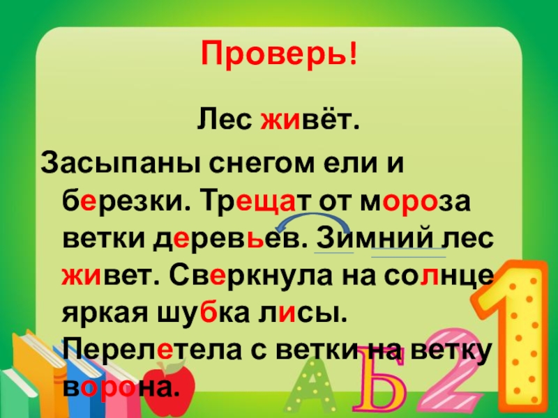 Проверь!Лес живёт.Засыпаны снегом ели и березки. Трещат от мороза ветки деревьев. Зимний лес живет. Сверкнула на солнце