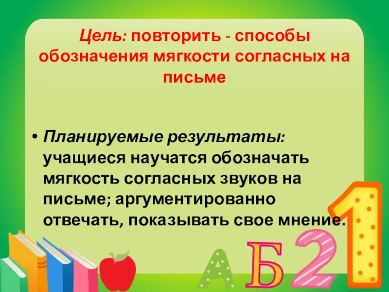 Цель: повторить - способы обозначения мягкости согласных на письмеПланируемые результаты: учащиеся научатся обозначать мягкость согласных звуков на письме; аргументированно отвечать, показывать свое мнение.