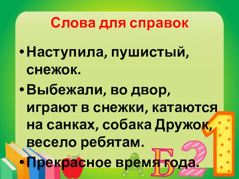 Слова для справокНаступила, пушистый, снежок.Выбежали, во двор, играют в снежки, катаются на санках, собака Дружок, весело ребятам.Прекрасное