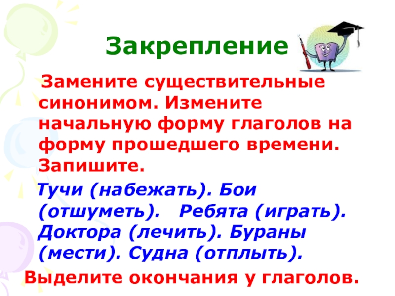 Замените существительные синонимом. Измените начальную форму глаголов на форму