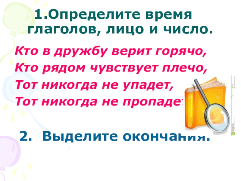 Слайд 4Определите время глаголов, лицо и число.