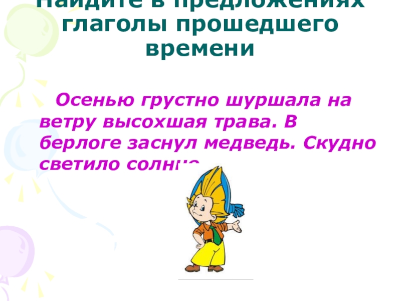 Слайд 6Найдите в предложениях глаголы прошедшего времени