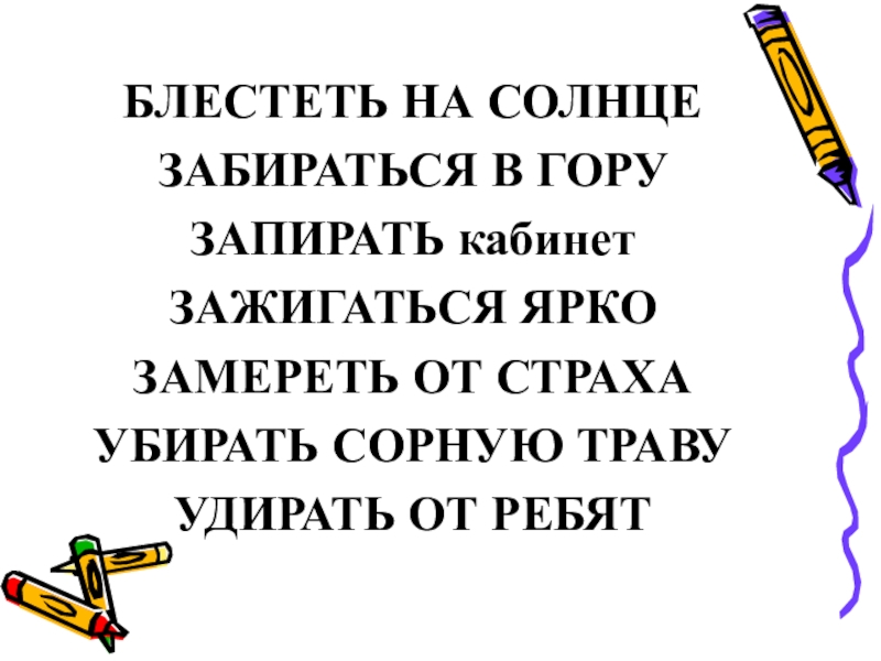 БЛЕСТЕТЬ НА СОЛНЦЕЗАБИРАТЬСЯ В ГОРУЗАПИРАТЬ кабинетЗАЖИГАТЬСЯ ЯРКОЗАМЕРЕТЬ ОТ СТРАХАУБИРАТЬ СОРНУЮ ТРАВУУДИРАТЬ ОТ РЕБЯТ