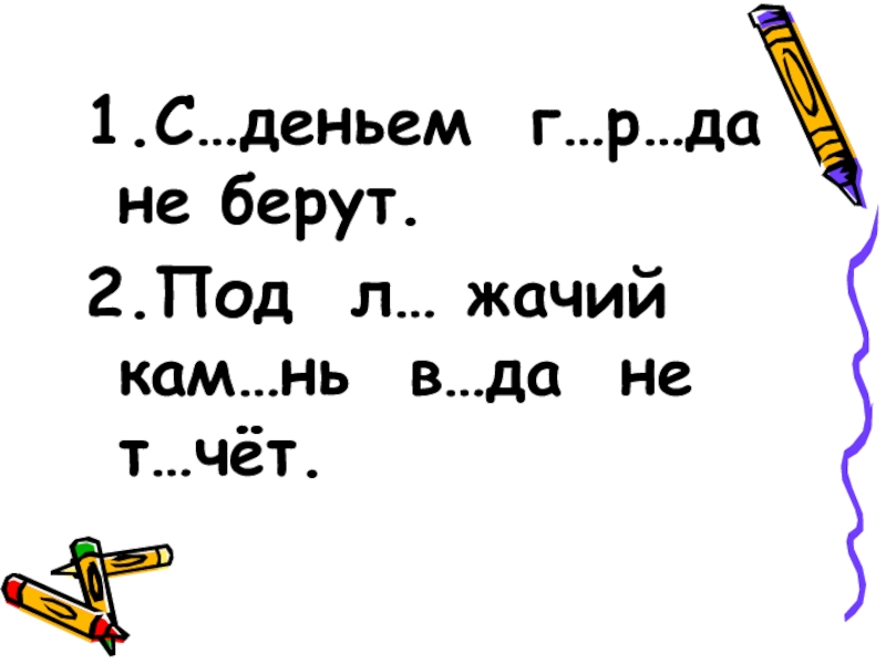 :           1.С…деньем г…р…да не берут.2.Под л… жачий кам…нь в…да не т…чёт.СОБИРАЙ ПО