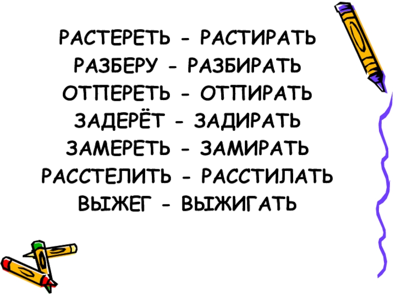 РАСТЕРЕТЬ - РАСТИРАТЬРАЗБЕРУ - РАЗБИРАТЬОТПЕРЕТЬ - ОТПИРАТЬЗАДЕРЁТ - ЗАДИРАТЬЗАМЕРЕТЬ - ЗАМИРАТЬРАССТЕЛИТЬ - РАССТИЛАТЬВЫЖЕГ - ВЫЖИГАТЬ