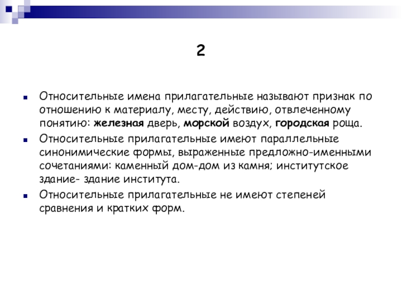Относительные имена прилагательные называют признак по отношению к материалу, месту, действию,