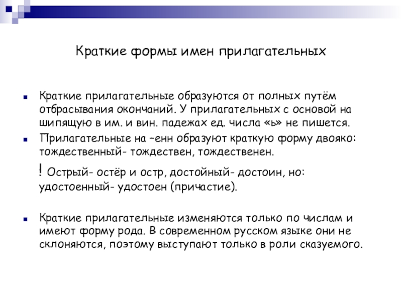 Краткие прилагательные изменяются только по числам и имеют форму рода. В современном русском языке они не склоняются, поэтому выступают только в роли сказуемого.