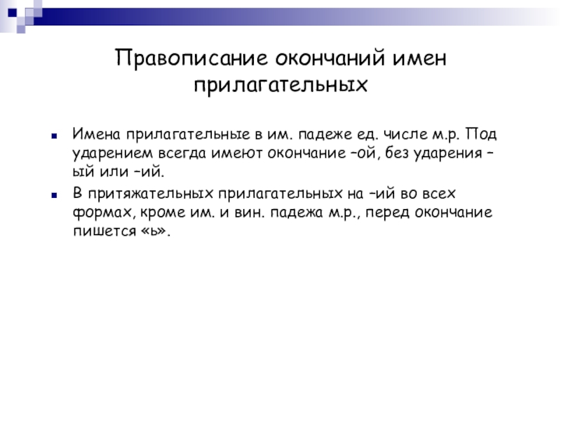 Имена прилагательные изменяется по родам, по числам, по падежам. Грамматические категории зависят от существительного, с которым оно согласуется. В предложении чаще всего выступает в роли определения, а может так же входить в состав сказуемого.