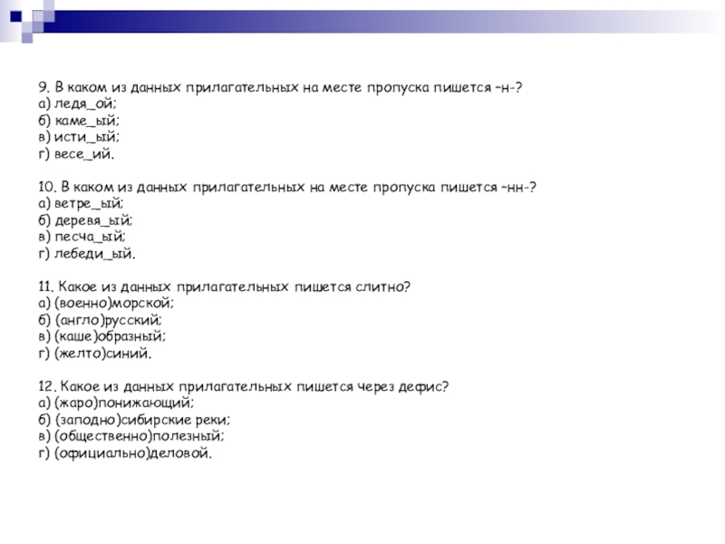 Слайд 249. В каком из данных прилагательных на месте пропуска пишется –н-?