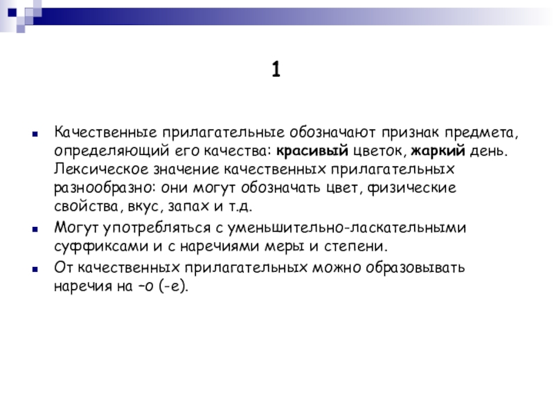 Качественные прилагательные обозначают признак предмета, определяющий его качества: красивый цветок, жаркий