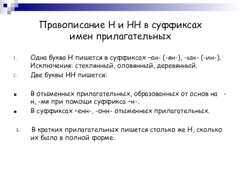 Одна буква Н пишется в суффиксах –ан- (-ян-), -ын- (-ин-). Исключения: стеклянный, оловянный, деревянный.