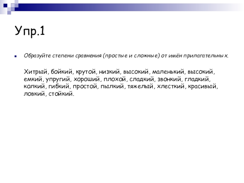 Хитрый, бойкий, крутой, низкий, высокий, маленький, высокий, емкий, упругий, хороший, плохой, сладкий, звонкий, гладкий, колкий, гибкий, простой, пылкий, тяжелый, хлесткий, красивый, ловкий, стойкий.