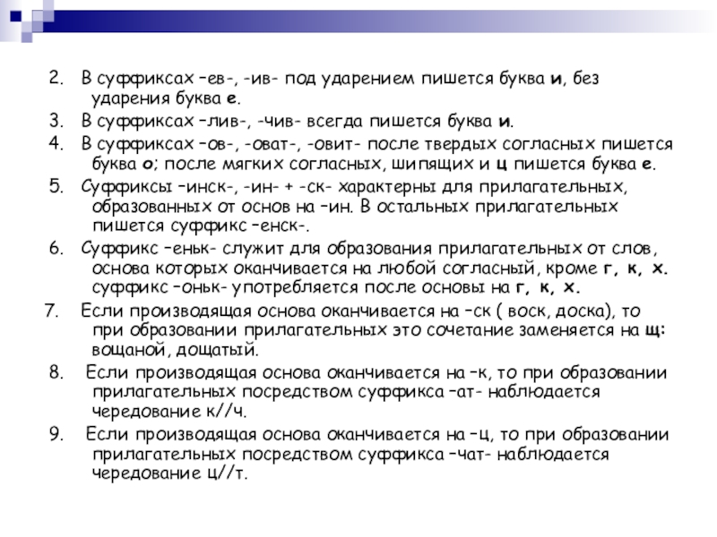 7. Если производящая основа оканчивается на –ск ( воск, доска), то при образовании прилагательных это сочетание заменяется на щ: вощаной, дощатый.