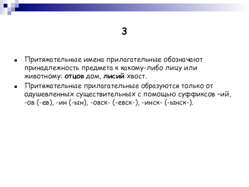 Притяжательные прилагательные образуются только от одушевленных существительных с помощью суффиксов –ий, -ов (-ев), -ин (-ын), -овск- (-евск-), -инск- (-ынск-).