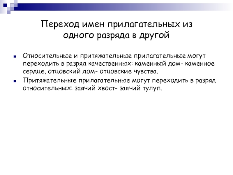 Относительные и притяжательные прилагательные могут переходить в разряд качественных: каменный дом- каменное сердце, отцовский дом- отцовские чувства.