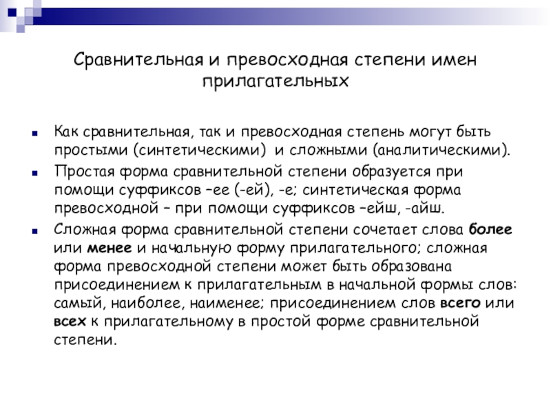 Простая форма сравнительной степени образуется при помощи суффиксов –ее (-ей), -е; синтетическая форма превосходной – при помощи суффиксов –ейш, -айш.