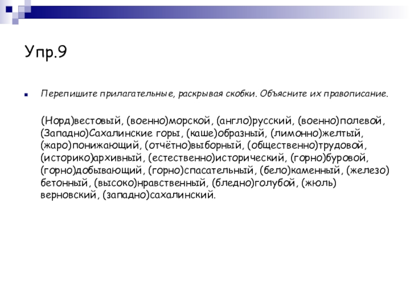 (англо)русский, (военно)полевой, (Западно)Сахалинские горы, (каше)образный, (лимонно)желтый, (жаро)понижающий, (отчётно)выборный, (общественно)трудовой, (историко)архивный, (естественно)исторический, (горно)буровой, (горно)добывающий, (горно)спасательный, (бело)каменный, (железо)бетонный, (высоко)нравственный, (бледно)голубой, (жюль)верновский, (западно)сахалинский.