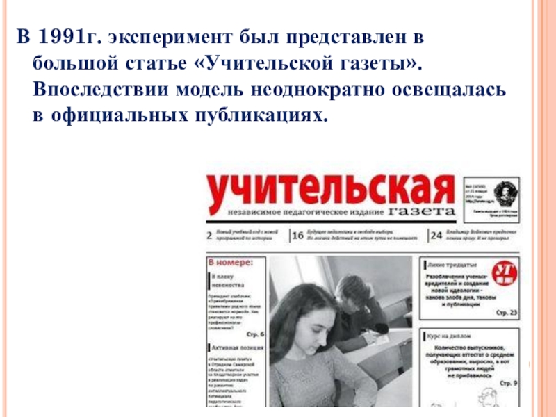 Слайд 3В 1991г. эксперимент был представлен в большой статье «Учительской газеты». Впоследствии