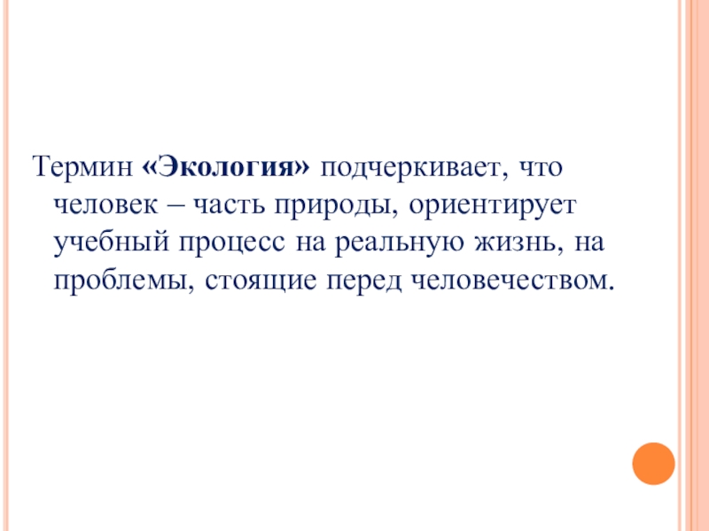 Слайд 5Термин «Экология» подчеркивает, что человек – часть природы, ориентирует учебный процесс на реальную