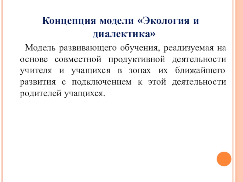 Концепция модели «Экология и диалектика»	Модель развивающего обучения, реализуемая на основе совместной продуктивной деятельности учителя и учащихся в