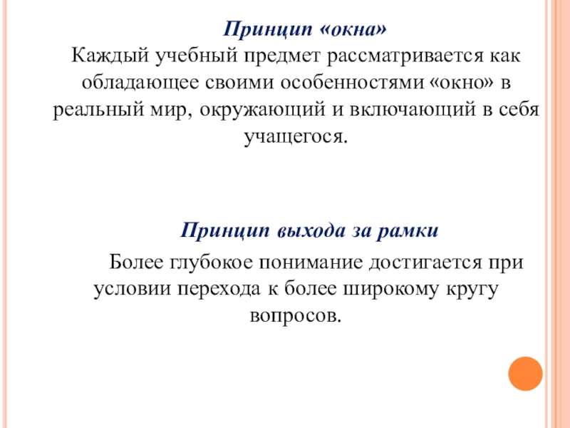 Слайд 8      Принцип «окна»  Каждый учебный предмет рассматривается как обладающее своими особенностями «окно» в