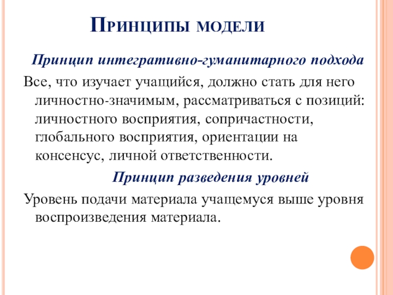 Принципы моделиПринцип интегративно-гуманитарного подходаВсе, что изучает учащийся, должно стать для него личностно-значимым, рассматриваться с позиций: личностного восприятия,