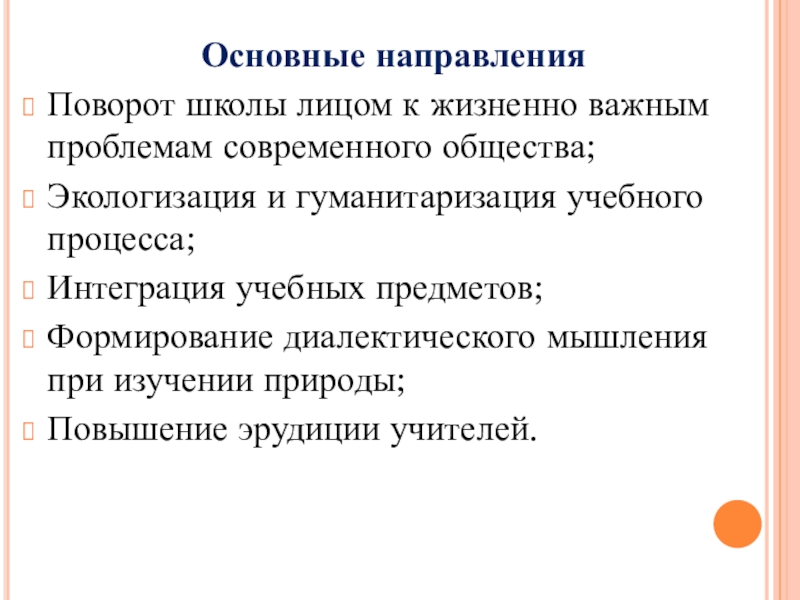 Основные направленияПоворот школы лицом к жизненно важным проблемам современного общества;Экологизация и гуманитаризация учебного процесса;Интеграция учебных предметов;Формирование диалектического