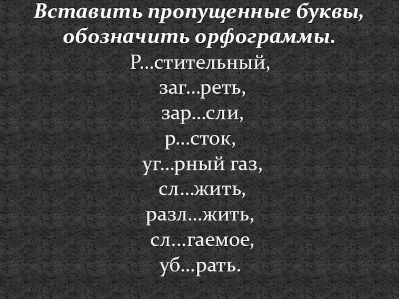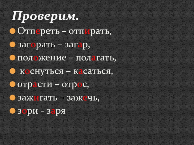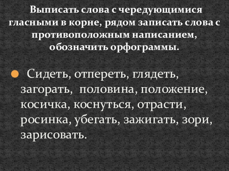 Выписать слова с чередующимися гласными в корне, рядом записать слова с противоположным написанием, обозначить орфограммы.