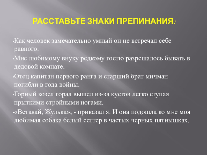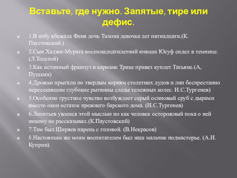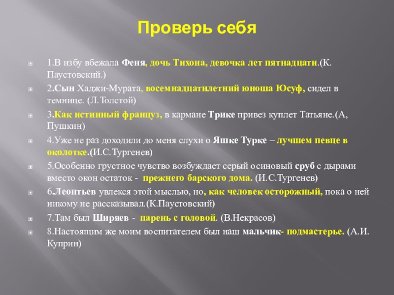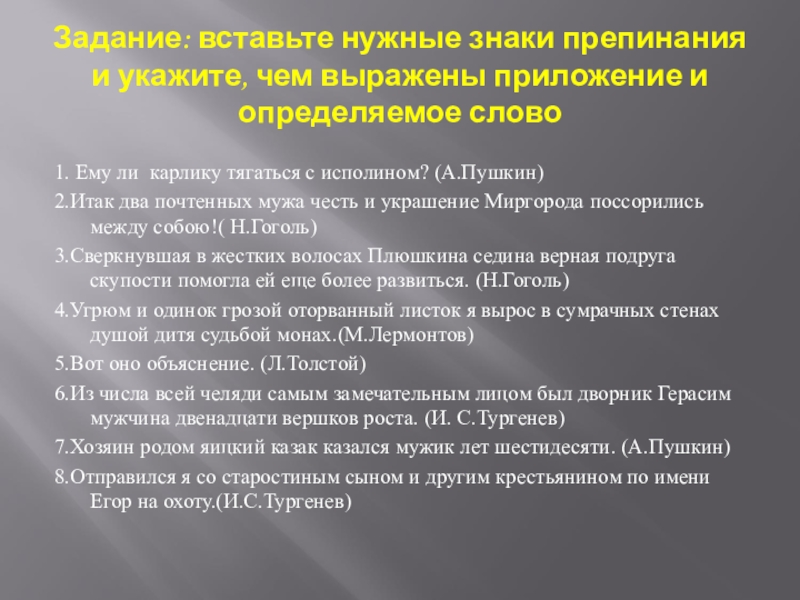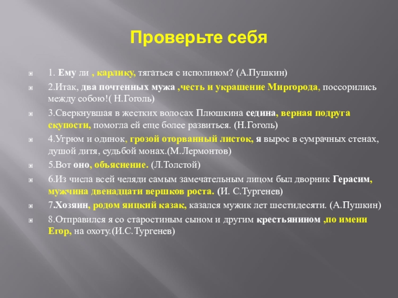 6.Из числа всей челяди самым замечательным лицом был дворник Герасим мужчина двенадцати вершков роста. (И. С.Тургенев)