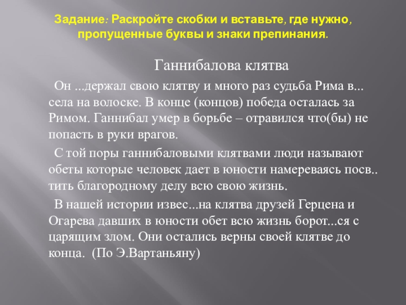 В нашей истории извес...на клятва друзей Герцена и Огарева давших в юности обет всю жизнь борот...ся с царящим злом. Они остались верны своей клятве до конца. (По Э.Вартаньяну)