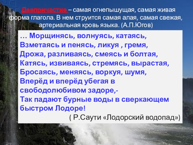 Деепричастие – самая огнепышущая, самая живая форма глагола. В нем струится самая алая, самая свежая, артериальная кровь языка. (А.П.Югов)