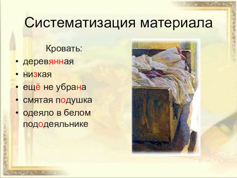 Систематизация материалаКровать:деревяннаянизкаяещё не убранасмятая подушкаодеяло в белом пододеяльнике